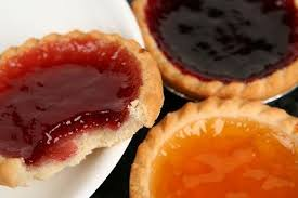 Jam tarts. A box of six usually contained two with red jam (strawberry or raspberry flavour), two with purple jam (blackcurrant of blackberry) and two with yellow jam (apricot jam or lemon curd). The jams were more of a flavoured, coloured gel with no discernible seeds or pips. But I loved them!