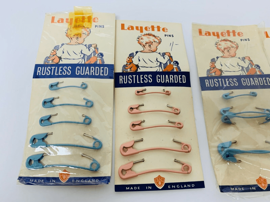 There were no disposable nappies. There still weren’t any when my children were born in the early 80s. Nappies were white towelling squares which were folded and pinned with special big safety pins called, appropriately enough, nappy pins. To add a waterproof outer layer a pair of thin rubber pants were pulled on over the nappy. These nappies needed to be boiled to keep them hygienic and white! When you consider that most households didn’t have washing machines or tumble driers the amount of work involved was enormous. I can remember pink and blue nappy pins ones like the ones in the photograph.