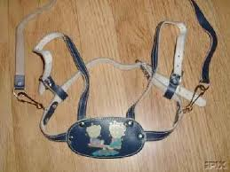 Very young children often wore reins like this when out with the family. I remember very clearly seeing children with walking reins on. They were leather and often pastel coloured with a picture on the front like these in the photograph. They were backed with a white fleecy fabric for comfort.