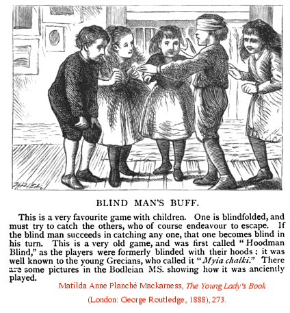 A version of the game was played in Ancient Greece where it was called “copper mosquito.” The game is played by children in Bangladesh where it is known as Kamanchi meaning blind fly. One individual is blind-folded in order to catch or touch one of the others who run around repeating, “The blind flies are hovering fast! Catch whichever you can!” The game was played in the Tudor period, as there are references to its recreation by Henry VIII’s courtiers. It was also a popular parlour game in the Victorian Era. Whilst researching for this post I learned that the name of the game is now considered offensive by some and that the blindfolding of a child can be looked on as dangerous. So maybe it’s disappeared altogether?